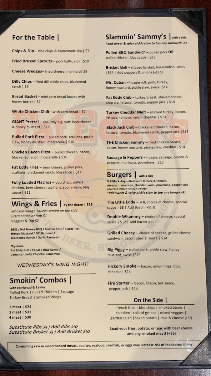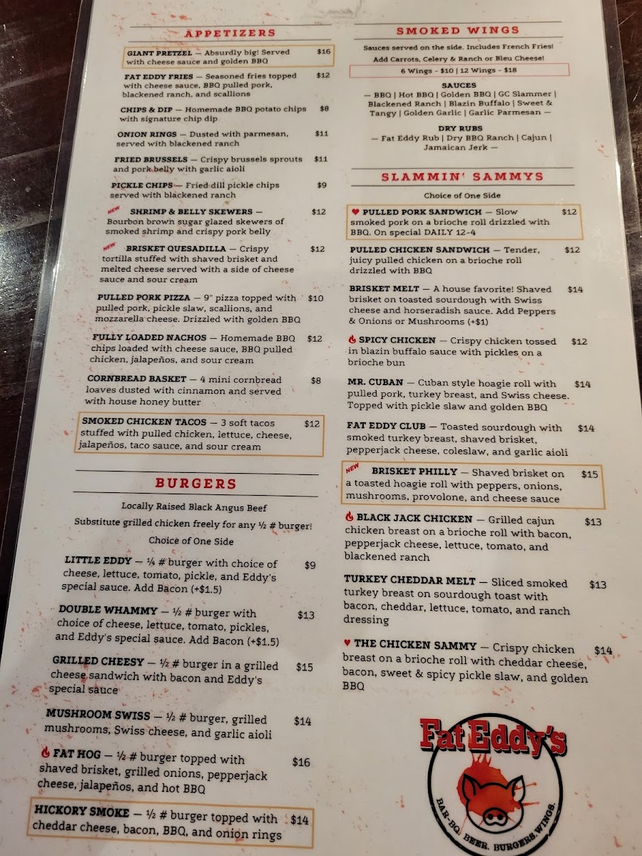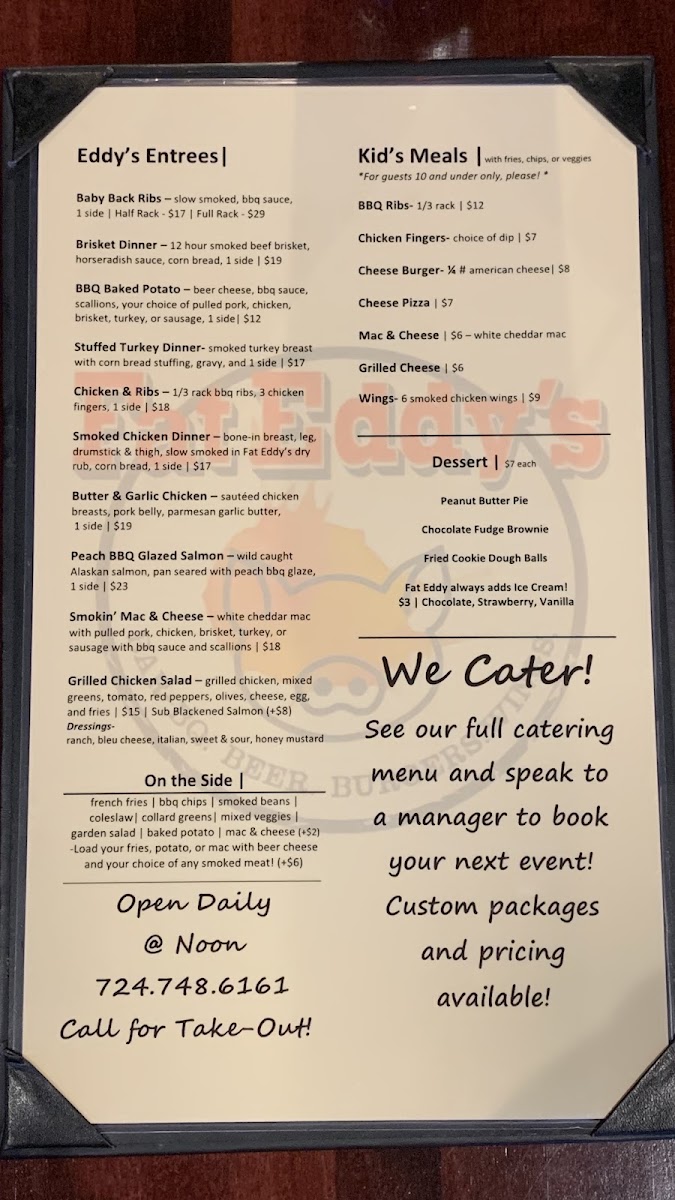 Welcome to Fat Eddy's Bar-BQ, where BBQ meets passion at 1920 Leesburg Grove City Rd, Grove City, PA. This establishment prides itself on a robust menu that celebrates wholesome flavors and generous portions. Guests can indulge in signature dishes like the mouthwatering BBQ combo plate and the highly praised Fat Eddy Fries, each crafted to perfection.